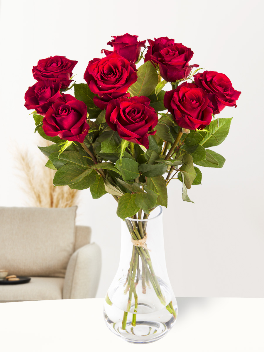 Verras iemand met een boeket van 10 rode rozen, bestel eenvoudig online, kies je gewenste leverdatum en verstuur het boeket! Bij de rozen zit een boekje met een aantal extra verzorgingstips voor de ontvanger. Het is bijvoorbeeld goed om de rozen op een schone glasvaas te zetten, een stukje van de stelen te snijden en het eerste zakje bloemenvoeding aan het water toe te voegen. Het tweede zakje kun je toevoegen na een week, dan krijgen de rozen extra voeding en zullen ze langer mooi blijven!