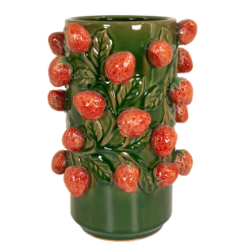 Een aardewerk vaas met aardbeien op de vaas gebakken. Een prachtige sierstuk voor in huis.