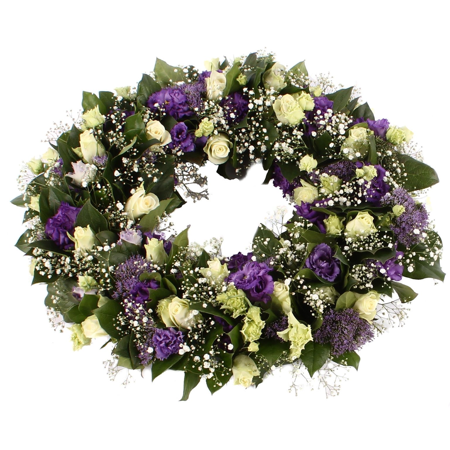 Deze Ajourkrans is opgemaakt met witte Rozen, paarse Lisianthus en Trachelium met Gips. De rouwkrans is beschikbaar in Groot (50 cm, zie afbeelding) en XL (60 cm). Een rouwlint of -kaart kunt u in de volgende stap toevoegen.