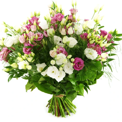 Boeket met alleen roze en witte eustoma’s. Bloemen lijken op rozen. Bestel online bij BoeketCadeau.nl