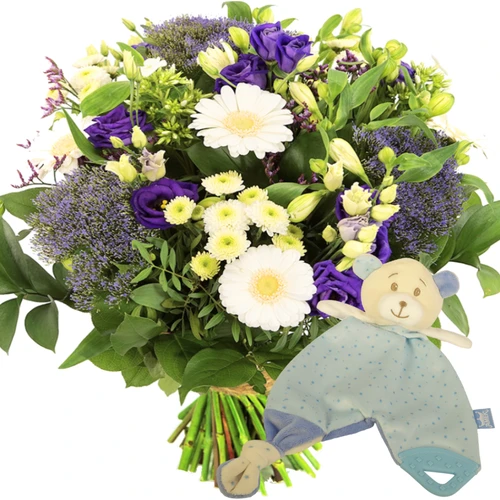 Geboorte bloemen voor een jongen, een wit blauw paars boeket en pluche tutteldoekje met beertje er op en een bijtring.