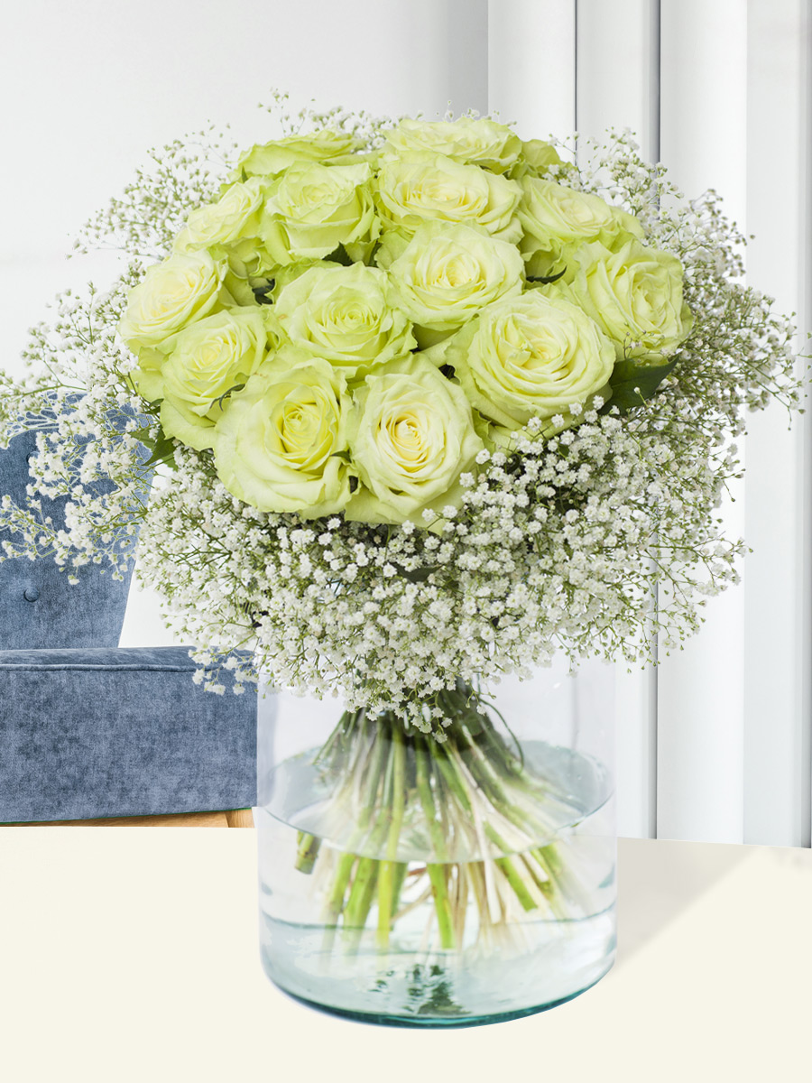 De rozen in dit boeket zijn van de soort Camouflage en worden door Ol Njorowa in Kenia gekweekt. De stelen van deze rozen zijn ongeveer 50 centimeter lang waardoor dit boeket op elke geschikte ruime vaas een blikvanger vormt. De rozen die gebruikt zijn in dit boeket hebben wij ook beschikbaar in andere boeketten. Bijvoorbeeld dit camouflageboeket met tarwegras (), of deze luxe Engelse pastelmix () met weer een heel ander uiterlijk. Het gipskruid in dit prachtige boeket maakt dat dit boeket een klassieke uitstraling heeft. Surprose heeft een breed assortiment van boeketten gebonden met gipskruid, zodat er voor iedereen een geschikt en prachtig boeket bij zit. Bestel en verzend nu dit stijlvol camouflage boeket met Surprose en verras de ontvanger. Vergeet niet het vak ‘persoonlijke wenstekst’ in te vullen om deze woorden te laten verschijnen op het gratis kaartje dat mee verpakt wordt bij het boeket in de verzenddoos.