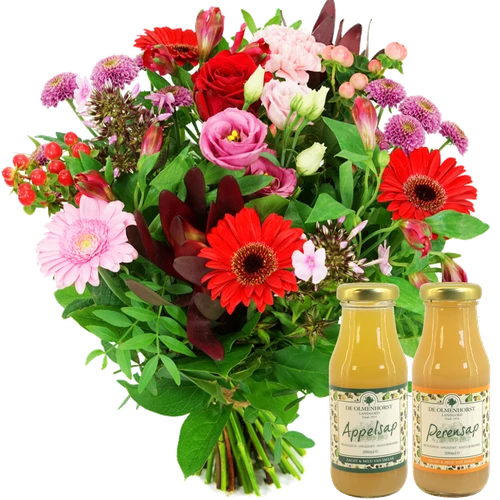 Een combinatie boeket in het roze rood samen met heerlijke Olmenhorst sappen in één luxe geschenkdoos bezorgt in heel Nederland. Thuiswinkel Lid.
