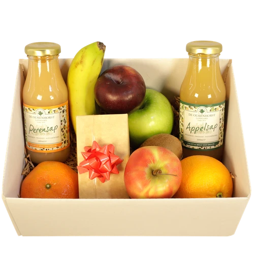 Een fruitbox met vers fruit, sappen van de Olmenhorst en heerlijke bloemetjes chocolade. Snelle bezorging.