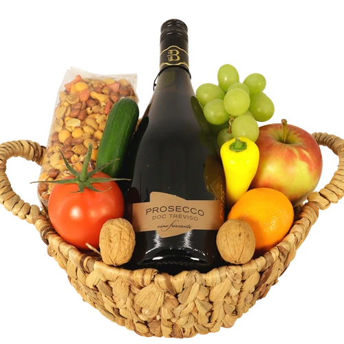 Heerlijke fruitmand gevuld met vers fruit prosecco en heerlijke borrelmixed zoutjes. Een lust voor het oog deze opgemaakte fruitmand om te mogen ontvangen. Bestel vandaag nog.