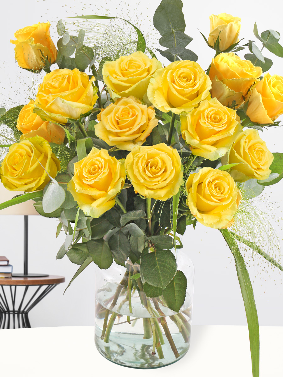 Een bekende gele roos van Surprose is deze gele roos van de soort Good Times. Dit hand gebonden boeket van de Good Times roos is afkomstig uit Kenia en wordt door Timaflor gekweekt voor Surprose. Dit boeket bestaat uit 15 van deze vol gele rozen (https://www.surprose.nl/rozen-bestellen/gele-rozen) en wordt met de hand samengebonden met panicum en eucalyptus om een volledig effect te creëren. Deze gele rozen hebben wij ook in ons assortiment in aantallen van 10, 20 of 30 rozen. Bij deze boeketten wordt er geen extra blad toegevoegd. Ook geven wij de optie om deze prachtige gele rozen in ieder aantal tot wel 500 stuks te bestellen! Kijk daarvoor bij onze categorie ‘kies je eigen aantal’ en laat je verrassen door alle mogelijkheden van Surprose. Vergeet bij het geven van dit gele rozenboeket als cadeau niet je ‘persoonlijke wenstekst’ achter te laten in het daarvoor bestemde vak. Laat in dit vak bijvoorbeeld weten van wie en waarom de rozen als cadeau verzonden zijn. Verras nu met dit volledige boeket met gele rozen van Surprose.
