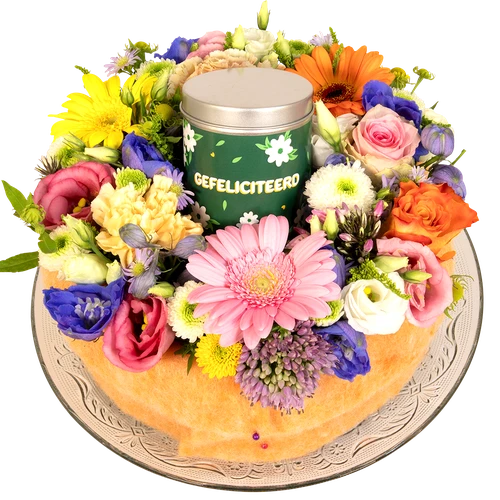 Bloemen cadeau geven voor een gefeliciteerd moment. Dit is een unieke cadeau. Een gefeliciteerd bloementaart met een blikje dropkrijtjes in de taart verwerkt. Bestel eenvoudig: