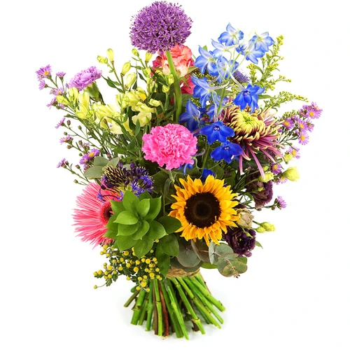 Bloemen van het seizoen, een bont boeket hoog en laag gerangschikt. Bestellen en bezorgen in heel Nederland. Thuiswinkel Lid. Versgarantie.