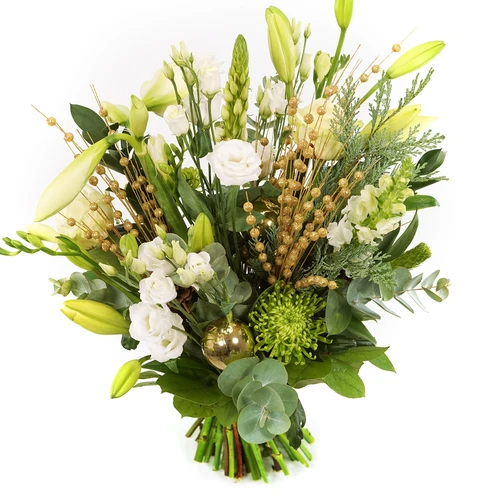 Plukboeket: Kerstboeket in de witte en gouden tinten. 7 dagen Versgarantie. Voeg een kerstkaart toe met jouw boodschap.