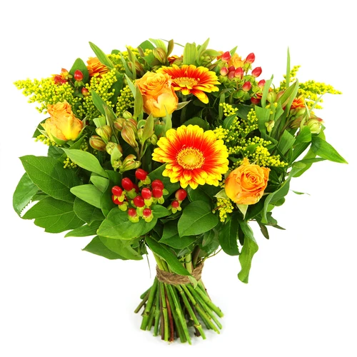 Boeket in de gele en oranje tinten. Verschillende bloemsoorten. Bestel eenvoudig online bij BoeketCadeau.nl