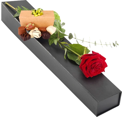 Geef op moederdag een rode roos in een luxe geschenkdoos samen met 150 gram heerlijke handgemaakte bonbons.
