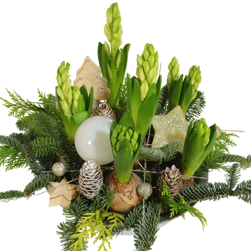 Dit Kerststuk vers gemaakt met heerlijke geurende witte hyacinten er in verwerkt. In een mooie waterdichte schaal kant en klaar voor op tafel. Thuiswinkel Lid.