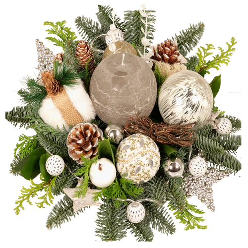 Een mooi kerststuk vers gemaakt met een licht grijze bolkaars in de naturel witte tinten opgemaakt. In het kerststuk zijn led bol lampjes verwerkt. Eenvoudig bestellen en laten bezorgen in heel Nederland. Thuiswinkel lid.