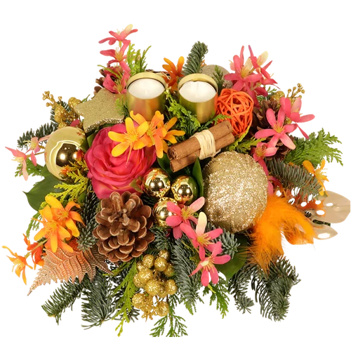 Kerststuk laten bezorgen in het roze-oranje-goud en 2 waxine houders. Dit kerststuk bevat de nieuwste trendy kleuren. Besttel eenvoudig. Thuiswinkel Lid.