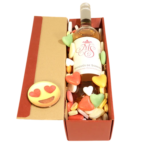 Valentijn wijn, gepresenteerd in een luxe rode geschenkdoos gevuld met mixed hartjes snoep. Geef deze cadeau op Valentijnsdag! Een absolute verrassing!