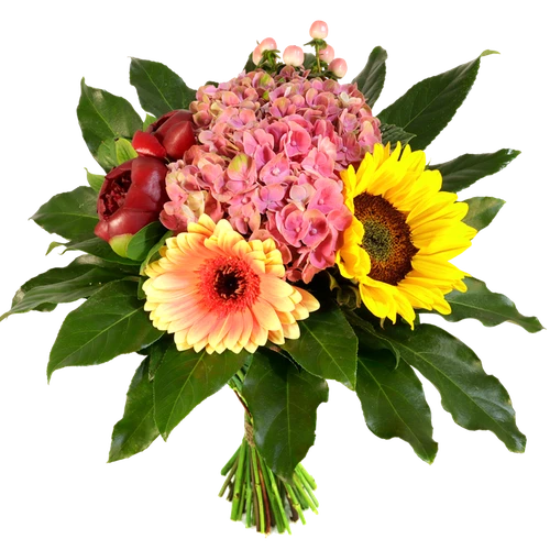 Een modern compact boeket met een Hortensia en een zonnebloem een compact laag gebonden boeket. De combinatie is anders dan anders. Bestel vandaag nog!