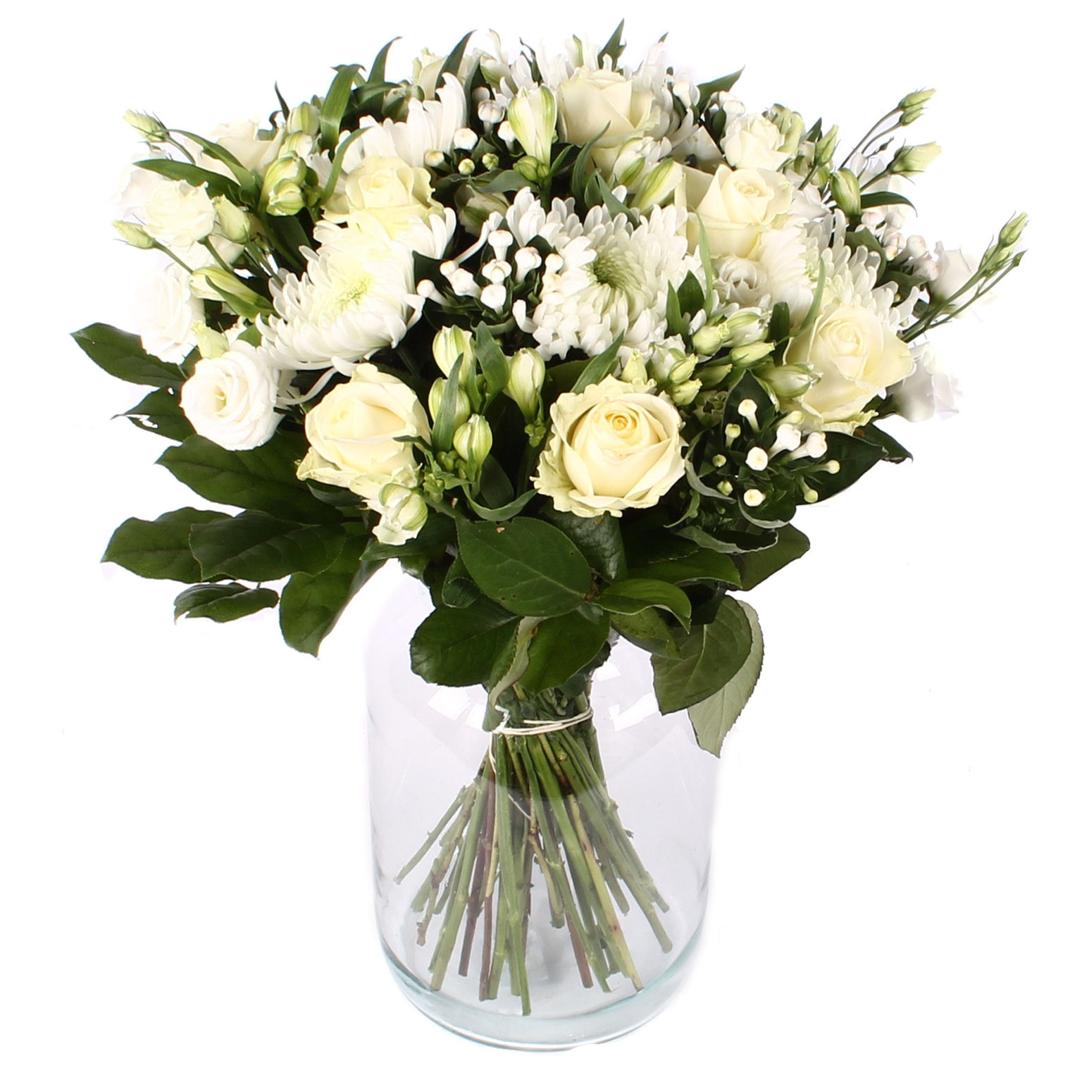 Nabestaanden boeket samengesteld met witte Rozen en witte bloemen naar keuze van de bloemist zo gelijkend mogelijk als de afbeelding. Dit boeket heeft een steellengte van ca 35 cm. Een rouwlint, -kaart of vaas kunt u in de volgende stap toevoegen.