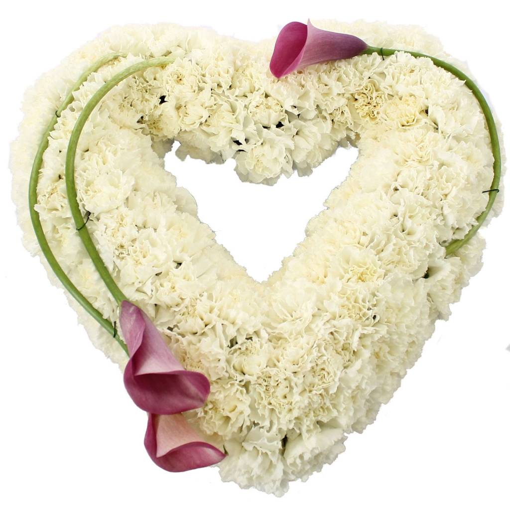Open Rouwhart van witte standaard Anjers. Dit rouwhart is beschikbaar in een ‘Groot’ variant en heeft een diameter van ca 50 cm. Een rouwlint of -kaart kunt u in de volgende stap toevoegen.