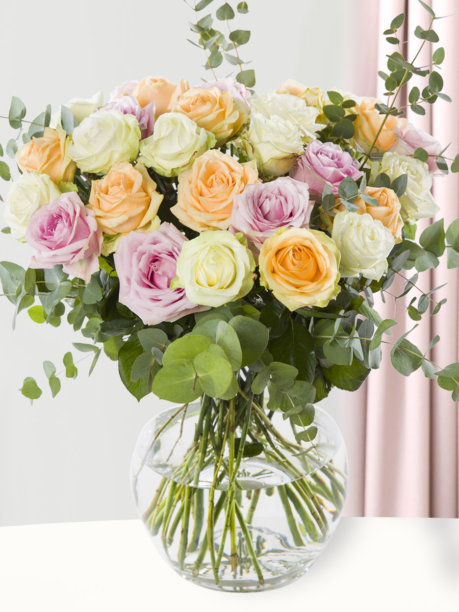 De rozen in dit boeket zijn van de soort Avalanche Peach, Avalanche Sweet en White Avalanche. De Avalanche roos staat onder de rozenkenners bekend als een uitmuntende roos met een bijzonder lang vaasleven. Dit zijn top kwaliteit rozen. De steellengte van deze rozen is maar liefst 60 centimeter waardoor dit boeket een pronkstuk in elk interieur vormt. Deze Avalanche rozen worden door v. d. Berg Roses in Nederland geweekt en zijn altijd direct leverbaar. Wist je al dat wij nog veel meer boeketten in ons assortiment hebben van deze Avalanche rozen? Zoek in de zoekbalk op ‘Avalanche’ en laat je verrassen door al deze prachtige boeketten. Onze bloemspecialisten zorgen er altijd voor dat dit boeket met liefde met de hand gebonden wordt. De verschillende rozen worden zorgvuldig en in de juiste verhouding bij elkaar gezocht en met eucalyptus gebonden totdat het een volledig en groot boeket is.