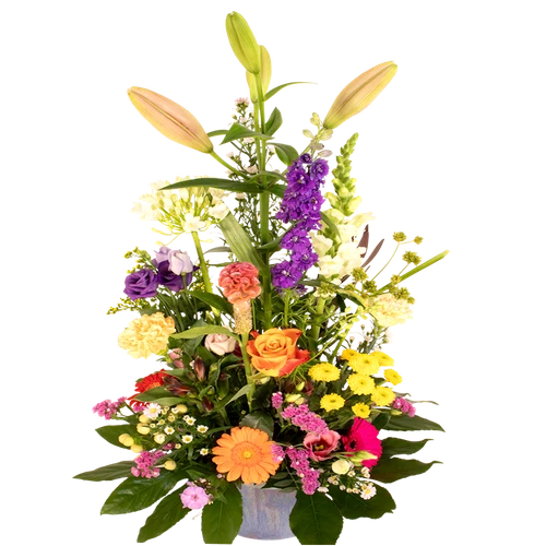 Een bont bloemstuk veelzijdig gerangschikt met de bloemen zoals ze zijn en zoals ze groeien, hierdoor krijg je een pluk effect in het bloemstuk. Hou je van bloemen ? Dan is deze zeer geschikt.