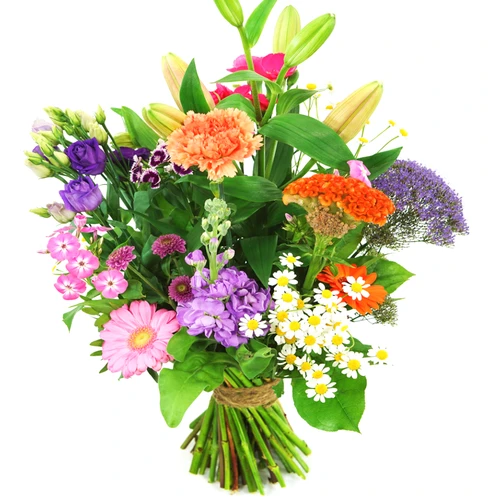 Verse boeket bloemen in de vorm van een Plukboeket oranje roze lila paars