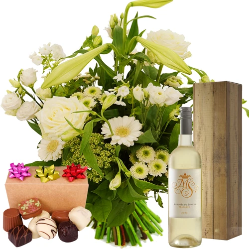 Witte verse bloemen een wit plukboeket voor Moederdag samen met heerlijke bonbons en een lekker flesje wijn laten bezorgen op Moederdag voor jouw moeder.