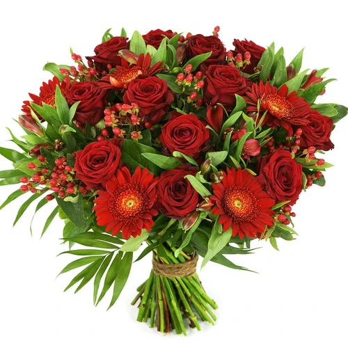 Een mooi boeket met rode rozen aangevuld met andere rode bloemen. Een echt bloemrijk liefdesboeket. Bestel bij BoeketCadeau.nl