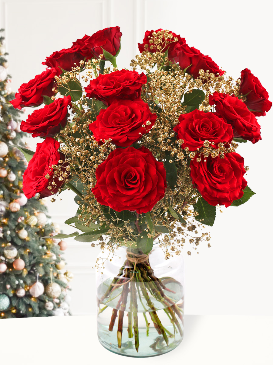 Dit boeket wordt vers van de kweker verzonden en hoewel de bloemen bij levering al goed open zijn, tonen de rozenkoppen pas na de eerste week hun volle volume, zoals op de foto te zien is. Ons rode rozenboeket met goudkleurig gipskruid past in elke middelgrote vaas.