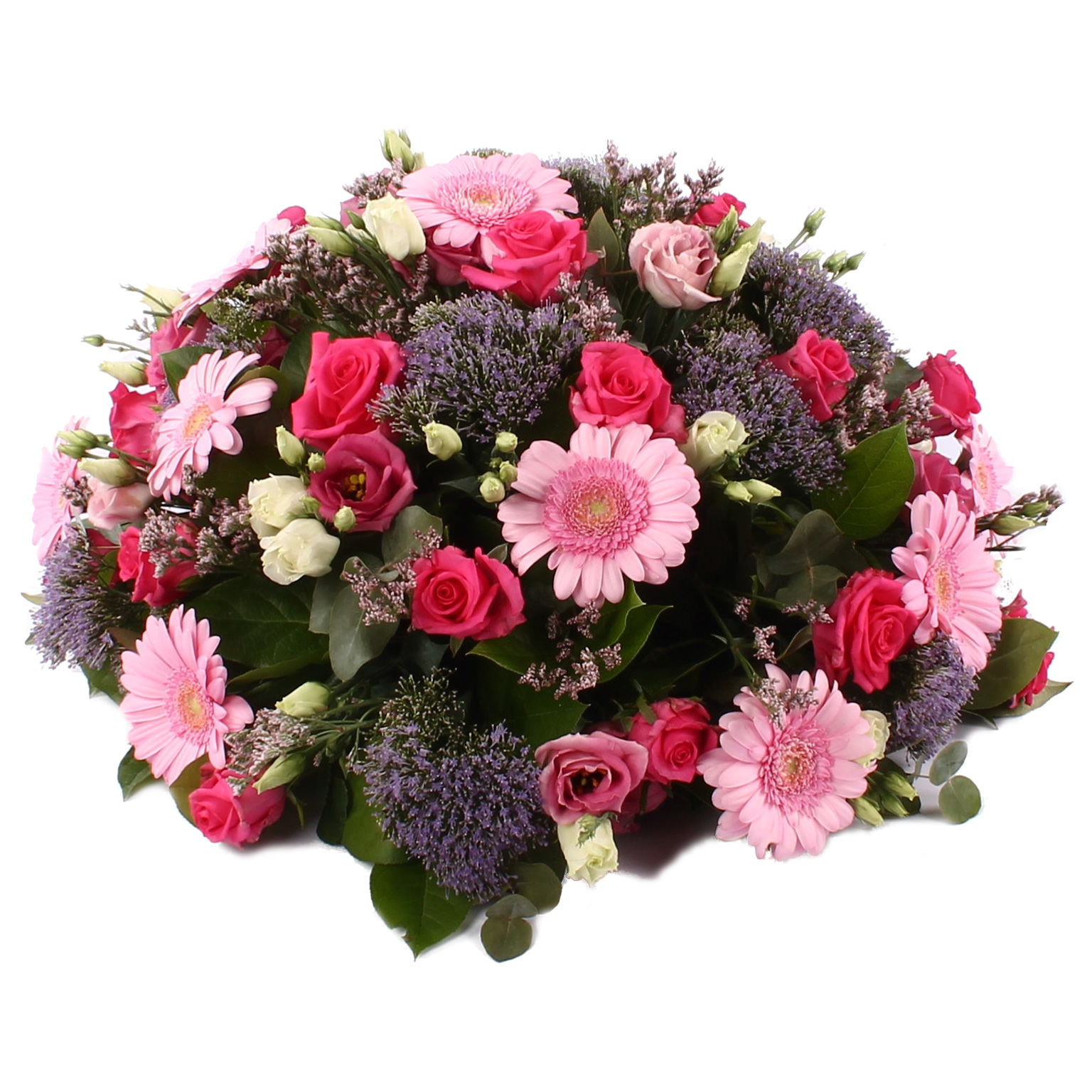 Rouwbiedermeier roze Germini’s en Karenza Rozen, aangevuld met een witte Lisianthus en blauwe Trachelium. Dit rouwstuk is beschikbaar in een ‘Groot’ variant en heeft een diameter van ca 40 cm. Een rouwlint of -kaart kunt u in de volgende stap toevoegen.