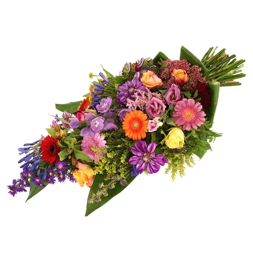 Rouwboeket bont met veel kleurrijke bloemen vanaf € 27,95 | Bijvoorbeeld voor een vrolijke overleden persoon ? Thuiswinkel lid. Vers garantie. Uitvaart bloemen.