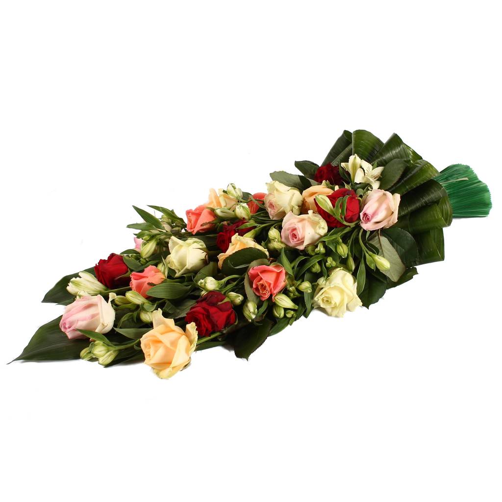 Handgebonden rouwboeket met gemengde Rozen, witte Alstroemeria en blad. Dit boeket heeft een steellengte van ca 55 cm. Een rouwlint of -kaart kunt u in de volgende stap toevoegen.