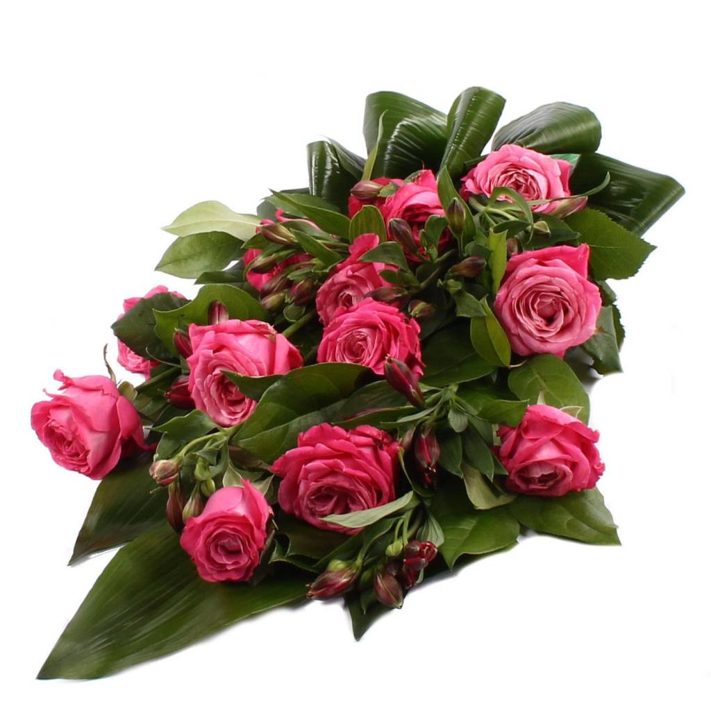 Rouwboeket donker roze Rozen met Alstroemeria en blad. Dit boeket heeft een steellengte van ca 40 cm. Een rouwlint of -kaart kunt u in de volgende stap toevoegen.