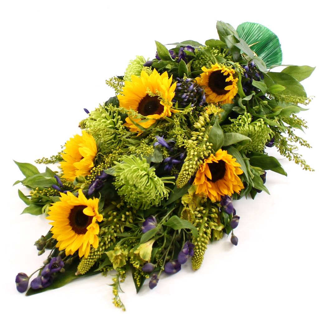 Rouwboeket zomers geel. Dit boeket heeft een steellengte van ca 55 cm. Een rouwlint of -kaart kunt u in de volgende stap toevoegen.