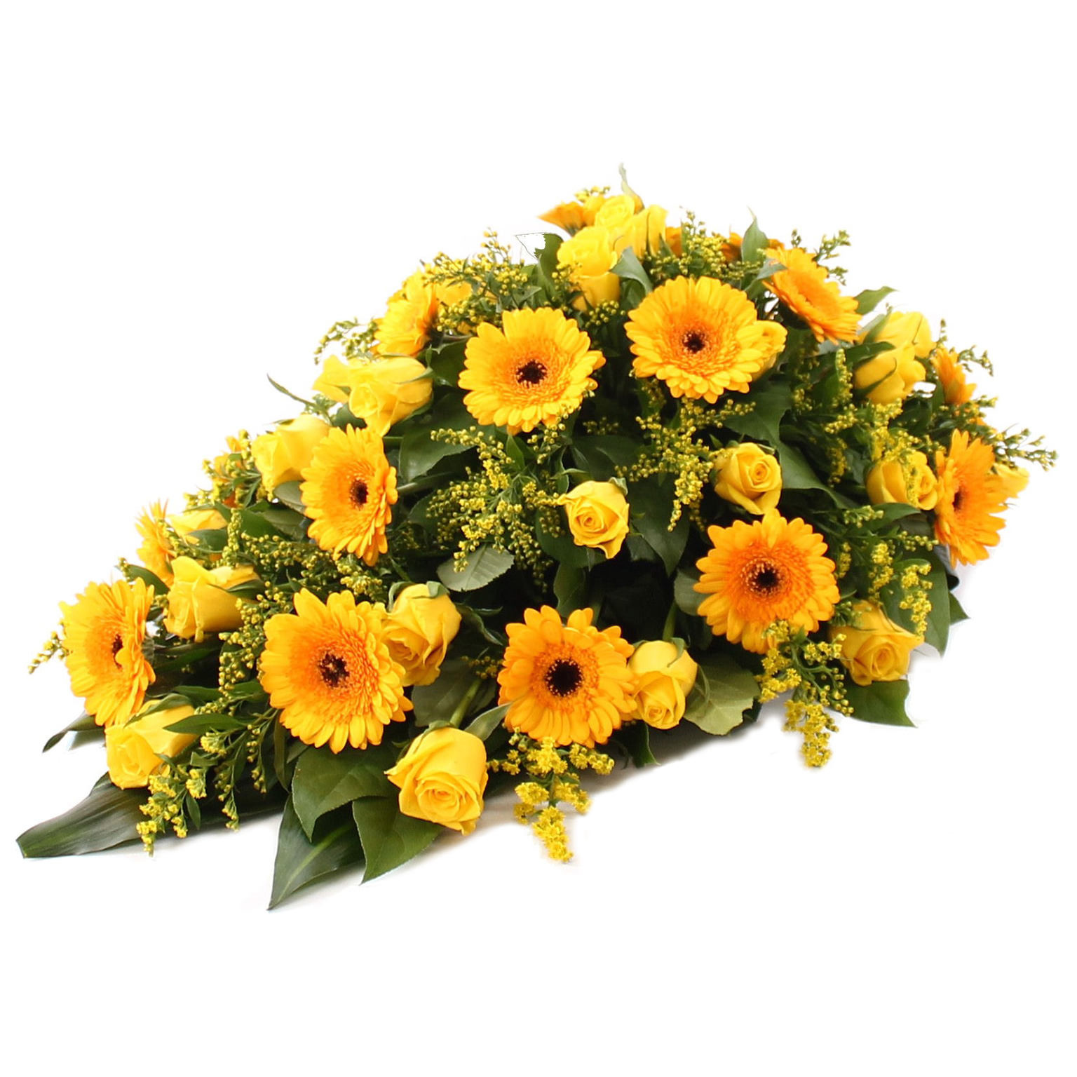 Rouwbloemstuk met gele Rozen en gele Germini afgewerkt met Solidago en divers bladmateriaal, opgestoken in een Graftakhouder. Dit rouwstuk heeft een lengte van ca 55 cm. Een rouwlint of -kaart kunt u in de volgende stap toevoegen.