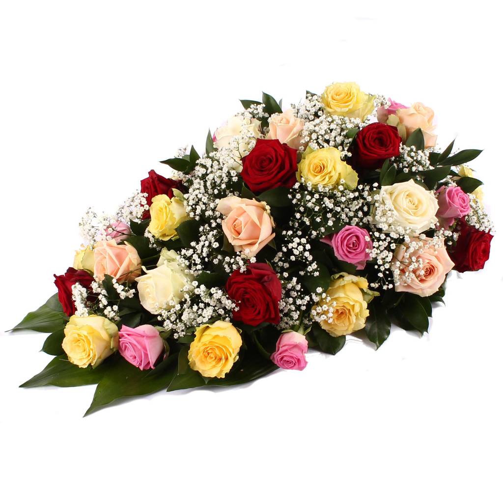 Rouwdruppel gemixte Rozen met Gipskruid. Dit rouwstuk is beschikbaar in een ‘Groot’ variant en heeft een lengte van ca 60 cm. Een rouwlint of -kaart kunt u in de volgende stap toevoegen.