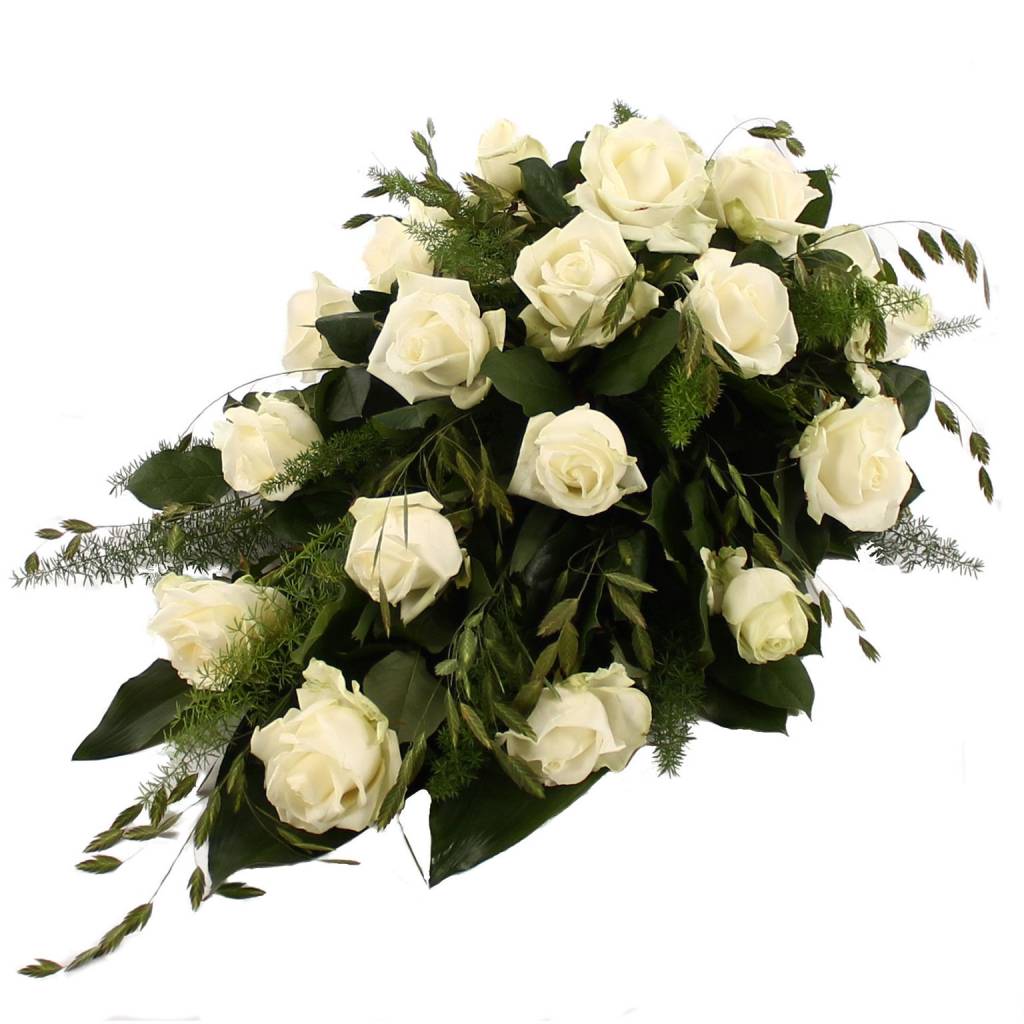 Rouwdruppel witte Rozen met Siergras. Dit rouwstuk is beschikbaar in een ‘Standaard’ variant en heeft een lengte van ca 50 cm. Een rouwlint of -kaart kunt u in de volgende stap toevoegen.