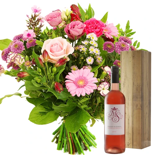Verse roze bloemen een mooie compositie om te laten bezorgen en met een lekkere fles rosé wijn geleverd. Thuiswinkel lid.
