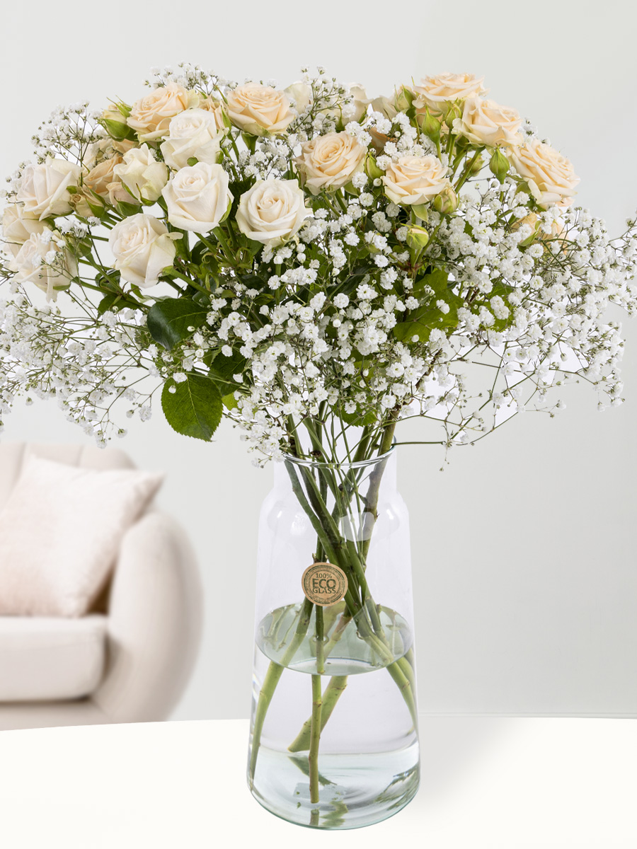 Deze trosrozen worden gekweekt in Nederland. De rozen zijn van witte/crème kleuren, gemengd met takken gipskruid. Door het binden van de trosrozen, zijn er vanuit elk opzicht rozen te zien. Een trosroos heeft namelijk aan een enkele steel meerdere roosjes zitten, op verschillende hoogtes. De trosrozen gemengd met het gipskruid zorgt dus voor een heel speels geheel!
