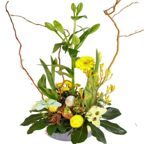 Voorjaars bloemen opgemaakt in een paasstuk, geweldig om te geven.